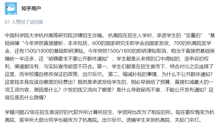 1月5日,有学生在网上曝出,中国科学院大学杭州高等研究院涉嫌招生诈骗。