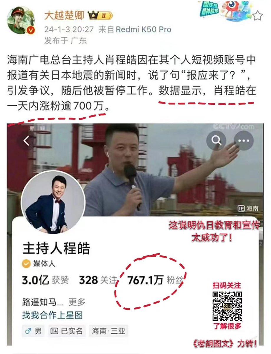 海南广电总台主持人肖程皓因在其个人短视频账号中报道有关日本地震的新闻时,说了句“报应来了?”,引发争议,随后他被暂停工作。【数据显示,肖程皓在一天内涨粉逾700万】【被停职主持人肖皓程迎来泼天富贵】他推荐的咀嚼片9.9一件,大卖1034.5万件,销售额超过1个亿了!