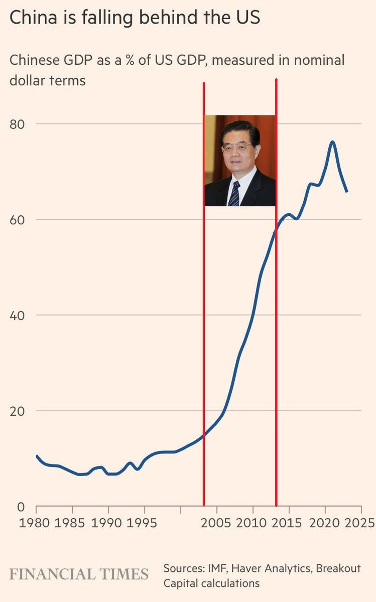 中国GDP占美国的比例开始下跌。FT很恶趣味的配了一个胡锦涛的图。