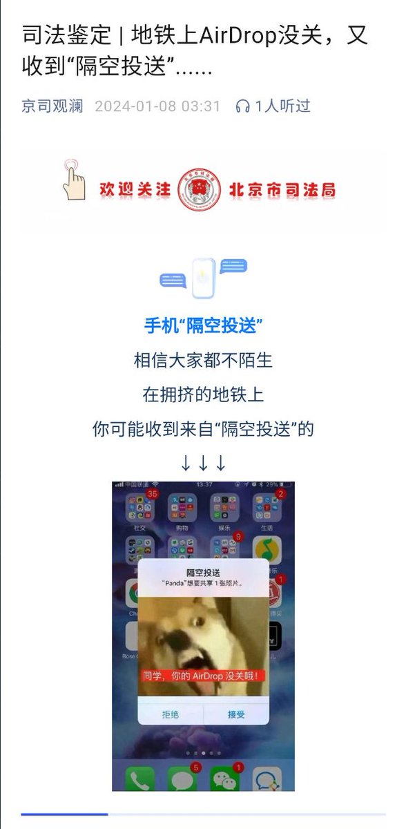 1月8日,北京市司法局官方微信公众号京司观澜发布文章称,针对地铁上使用Airdrop功能传播投送非法内容,北京一家司法鉴定所称他们破解了Airdrop传输原理中手机号和邮箱的加密字段,从而可以快速从被发送者的手机上提取锁定Airdrop发送者的手机号和邮箱,并成功帮助公安机关确定多名犯罪嫌疑人。…
