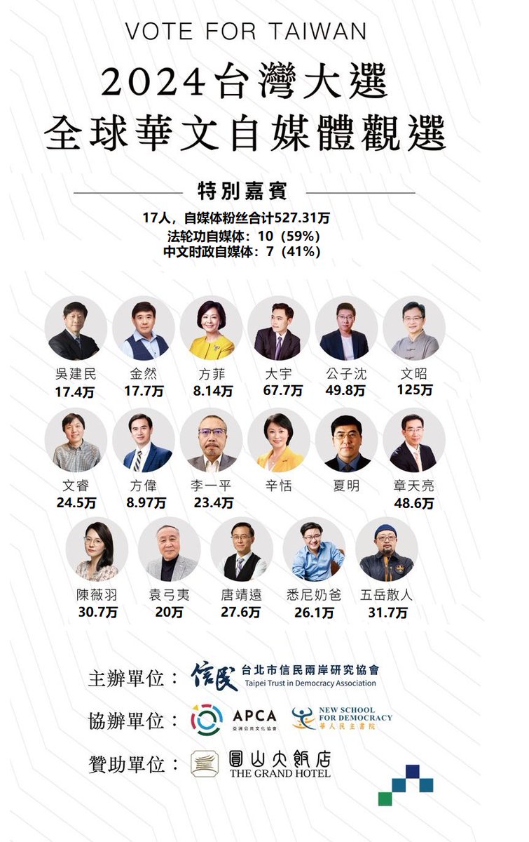 “孤胆英雄”王志安把自己整成这个模样,可怜兮兮的一个人躲在角落孤独的吃饭,有些凄凉。而一群中文时政自媒体人相聚在台北,笑语欢声。接下来是报道台湾大选的比拼,人数17:1,粉丝5:1(527:113),力量对比悬殊。除此之外,没有去台湾的中文政自媒体也不甘寂寞,安插台湾前线的耳目,远程报道大选实况