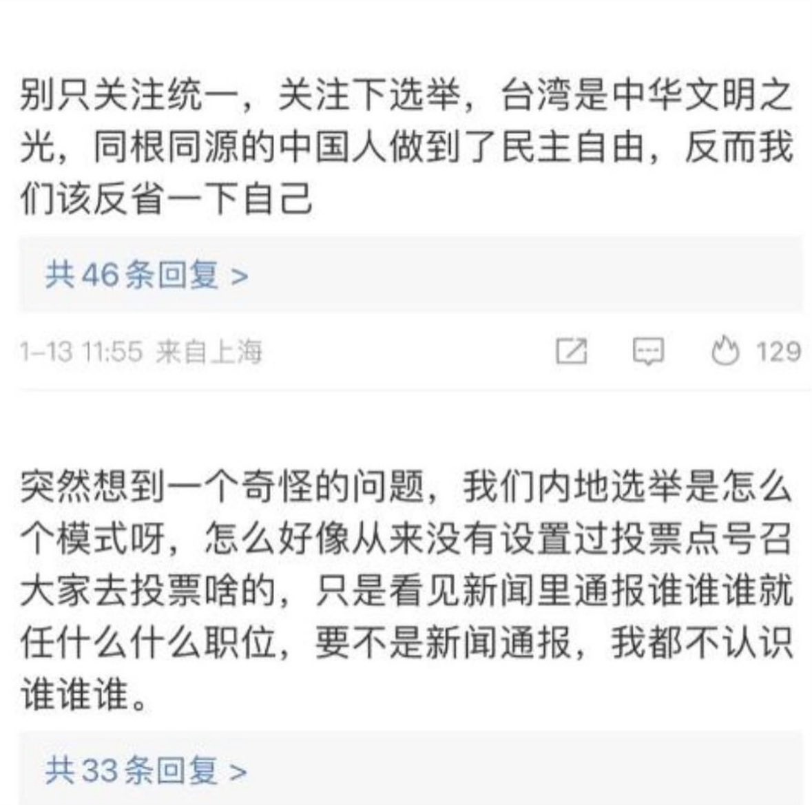 尽管被当局封杀,中华民国总统大选仍旧在墙内掀起讨论👇