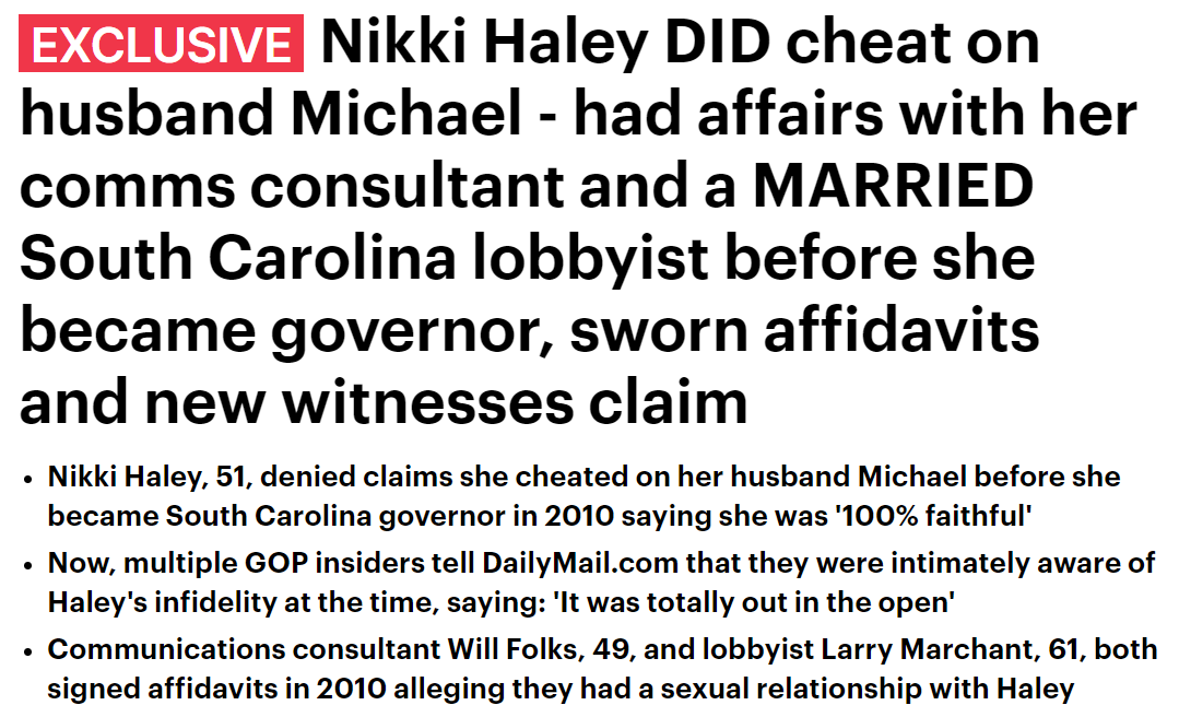 最新消息 :尼基-黑莉确实背叛了丈夫迈克尔,给他带了绿帽子 - 每日邮报