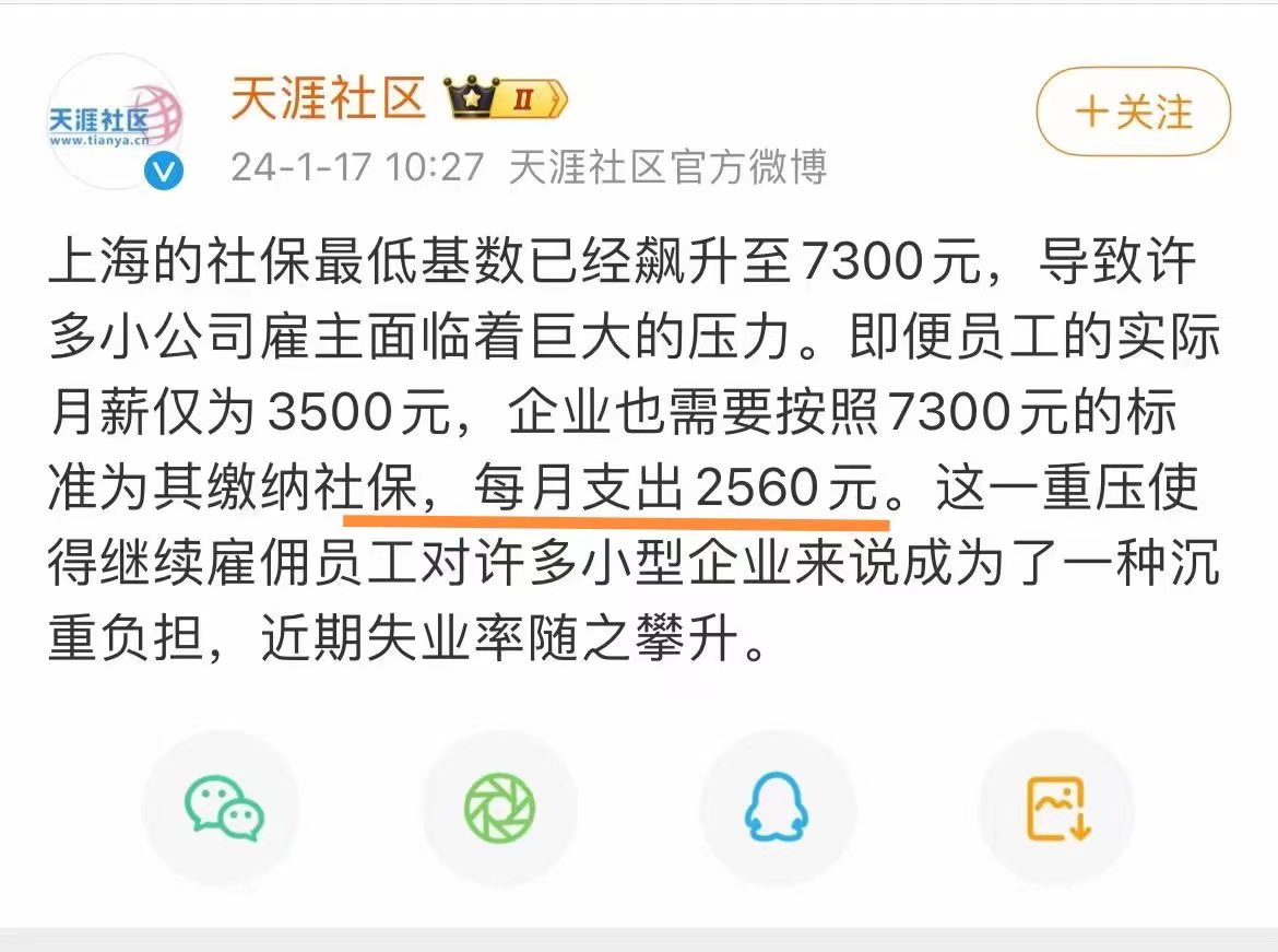 已向上海人求证。【上海的社保最低基数已经飙升至7300元】导致许多小公司雇主面临着巨大的压力。即便员工的实际月薪仅为 3500元,企业也需要按照7300元的标准为其繳纳社保,每月支出2560元。这一重压使得继续雇佣员工对许多小型企业来说成为了一种沉重负担,近期失业率随之攀升。
