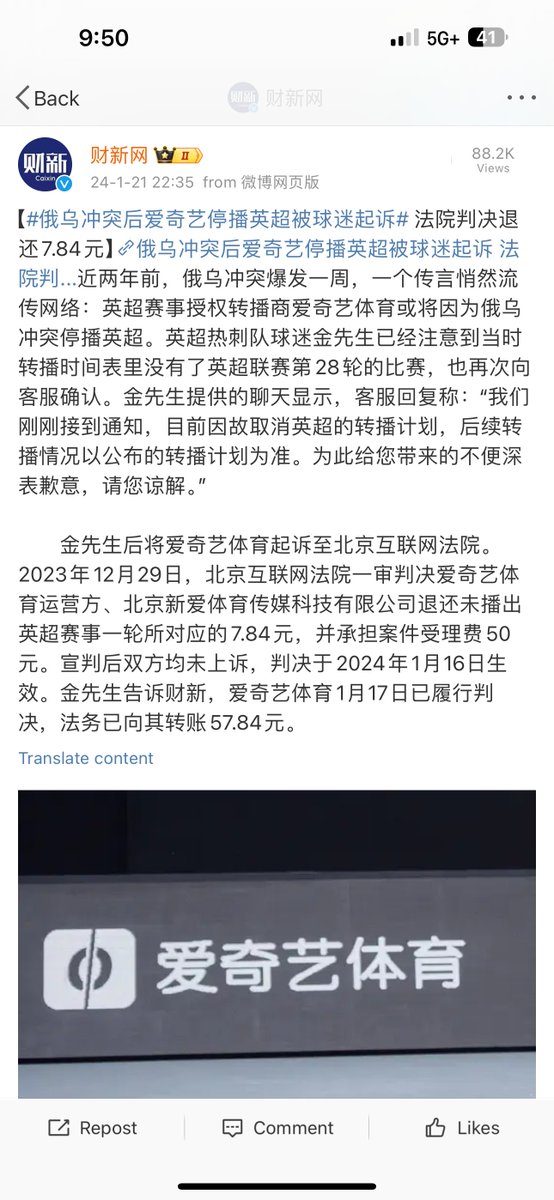 因为观众席频现反对俄罗斯发动战争的标语,爱奇艺受到压力停播了英超,被买了VIP的客户告了。法院判决爱奇艺败诉,返还对方7.84元,承担案件受理费50元。比判决结果更奇葩的是,连俄罗斯都没有停播英超。