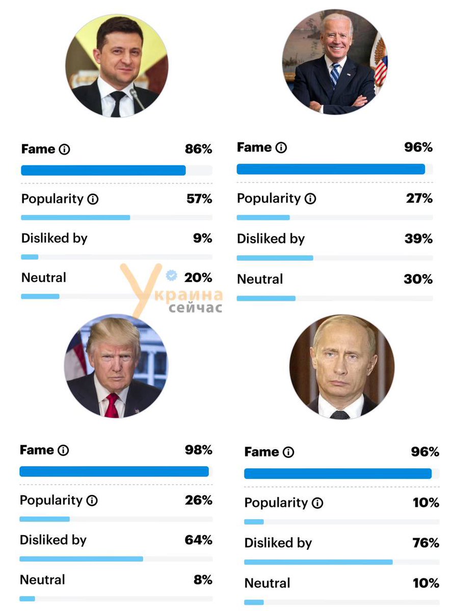 YouGov 民調顯示澤倫斯基是美國最受歡迎的活躍政治家烏克蘭總統獲得了57%的支持率、接下來是現任美國總統拜登(27%)和前總統川普(26%)普丁獲得了10%的支持率。