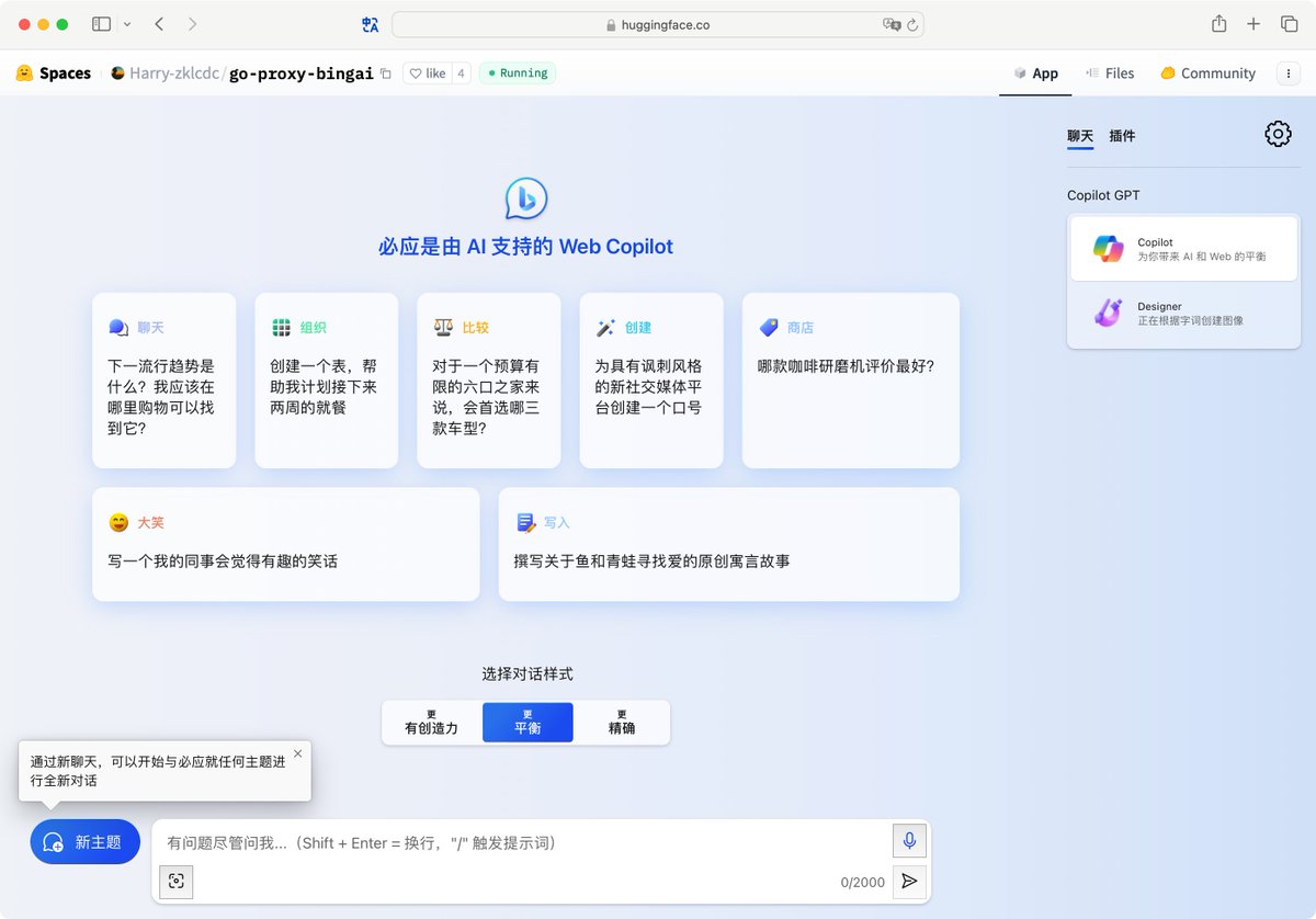 Go-Proxy-BingAI 基于微软 New Bing 定制的 BingAI 演示站点,UI 体验一致, ChatGPT 提示词, 基本兼容 BingAI 所有功能, 支持 OpenAI 格式 API 调用一键部署, 国内可用。*** Bing 获取 Cookie 太繁琐了,还要过人机验证。