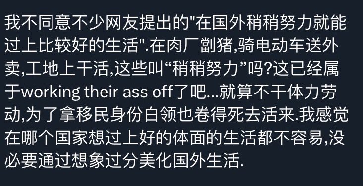 其实我很同意这个网友说的,很残酷的一点就是,没拿身份(绿卡or国籍)之前,会面对一系列的问题,比如学费,之所以这么疯狂的打工,不就是因为想凑天价学费么?flinders读护理,本地人4000多,外国人直接4w澳币,你和谁讲理去?那本质上你爹妈没本事,不能给你安排到位了,不就得靠自己疯狂打工赚钱么? 我当年不也是疯狂打工攒学费,然后选择读护理(因为拿绿卡最容易),拿了身份之后,自然就海阔天空了。我之前也说了,很多轻松的体制内工作,只对绿卡(甚至国籍)开放。 拿身份,永远是第一步,有了第一步,才有后面的发展。