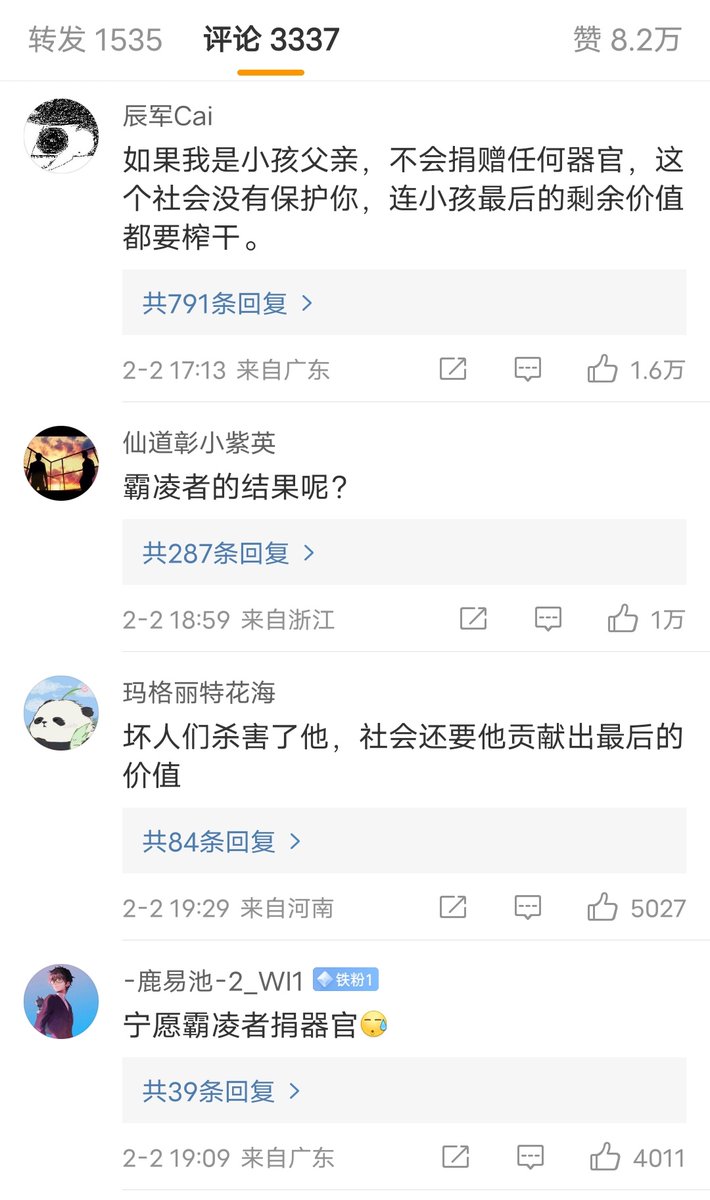2月1日,广东一中学被校园霸凌身亡的13岁男孩捐献器官,帮助7人重获新生。网友表示愤慨:“他救了7个人,但是没人救他”、“宁愿捐霸凌者的器官”。此外,有人对新闻的导向表示了疑惑,难道受害者就该得到这样的结果?