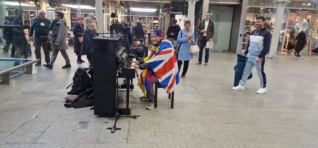 周日重磅: 闻名海内外的伦敦钢琴旁惊现雪山狮子旗。 今天2月4日流亡英国的西藏自由活动人士云尼在伦敦钢琴旁展示雪山狮子旗,支持钢琴家对抗中共的决心,这是自伦敦钢琴事件后第一次有藏人出现在这个捍卫艺术自由的阵地。云尼和他的四位支持西藏自由的英国伙伴长期在伦敦中国大使馆前举牌抗议中共政权