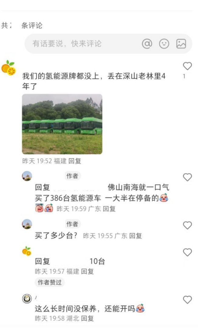 2月6日,有网友曝光佛山数辆价值上百万的氢燃料公交车停在车场“吃土”,称“因运营成本过高,加氢站缺氢”这些单台价值上百万的氢气车只能被迫在停车场吃土。2019年,佛山市南海区曾发布一则燃料电池公交车采购项目公告,共计4批386辆,每辆氢燃料电池公交车单价最高限价199万元。