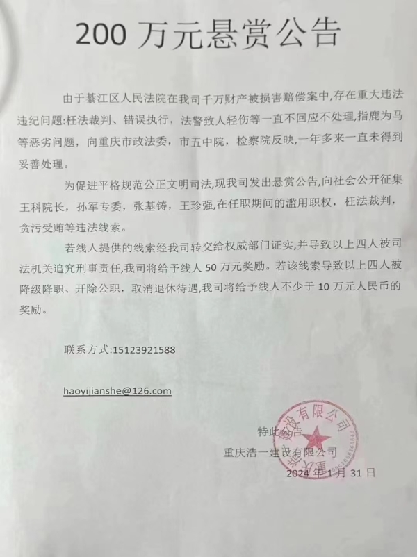 又一起!傳重慶民企懸賞征集本地法院院長貪腐證據這是準備魚死網破了!