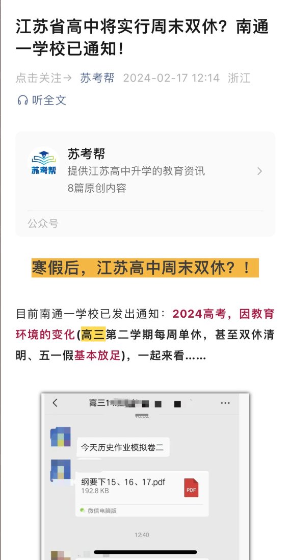 继此前江苏高中生连环跳楼引发全省提前放寒假后,2月17日,网传江苏高中新学期将全面恢复周末双休制度,并取消晚自习。不过目前根据江苏学生的反馈,上有政策下有对策,很多学校已经与大年初三至初五期间强制“自愿返校”了。不过目前根据新闻,江苏省教育厅已经下达指示严禁提前开学