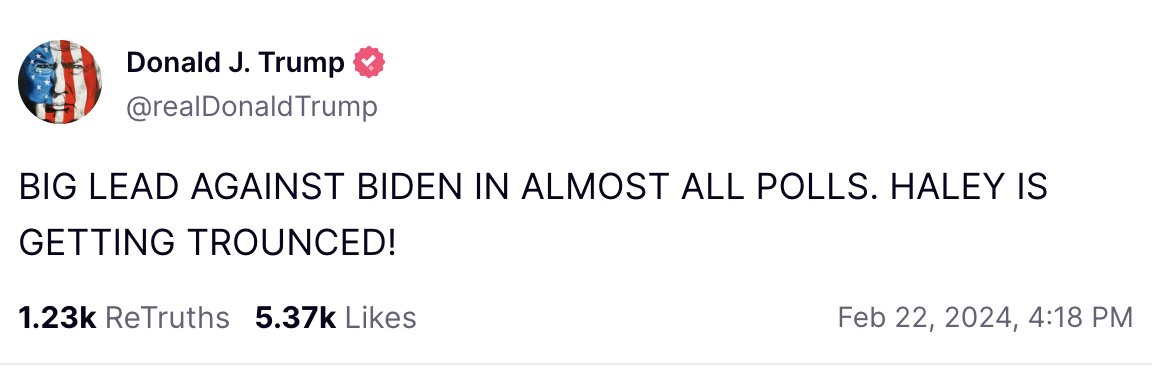 Just because Donald Trump says something doesn't make it true. The latest Marquette poll has me beating Biden by 18 points. Trump? It's a statistical tie.Republicans will not win in November with Trump on the ticket.