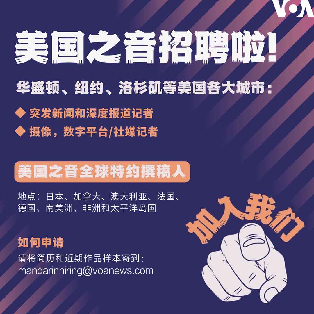 美国之音中文部全球招聘人才。欢迎有热情、有才华、认同美国之音理念的记者,加入我们的团队!请将履历、简介和近期作品样本寄到: mandarinhiring 详情: