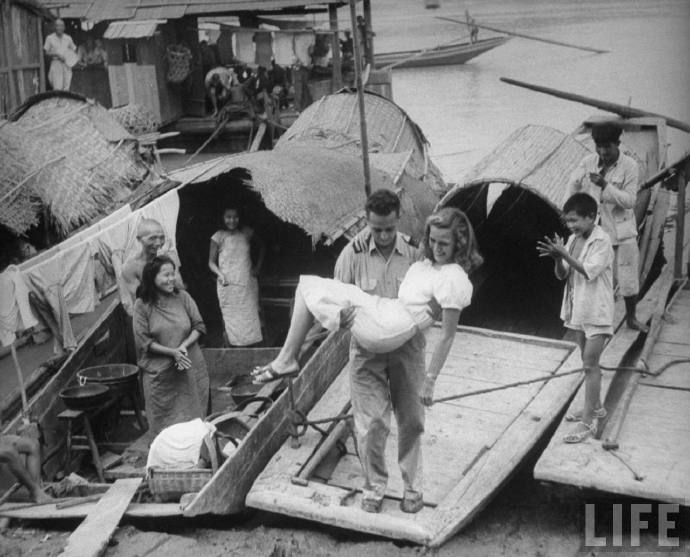 1945年10月,重庆。美军记者Palmer Hoyt III 抱着他的女友Barbara Stephens上岸,围观的中国人发出善意的微笑。