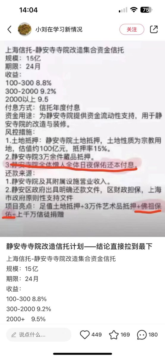 以为是故事,一搜还真有,2017年的套路,也不知后来咋样了?【上海信托-静安寺寺院改造集合资金信托】项目亮点:足值土地抵押+3万件艺术品抵押+佛祖保佑+上千万信徒捐赠