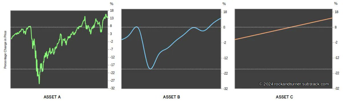 相信多数人会选择C,因为单边上扬,一路上没有波动。而A和B虽然最后都涨了,但中间太折腾闹心。