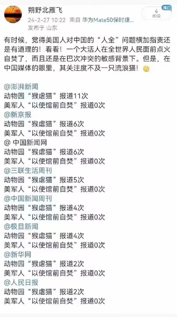 有网友开始统计并质疑为什么国内主流媒体不报道美军人在以色列使馆前自焚的消息