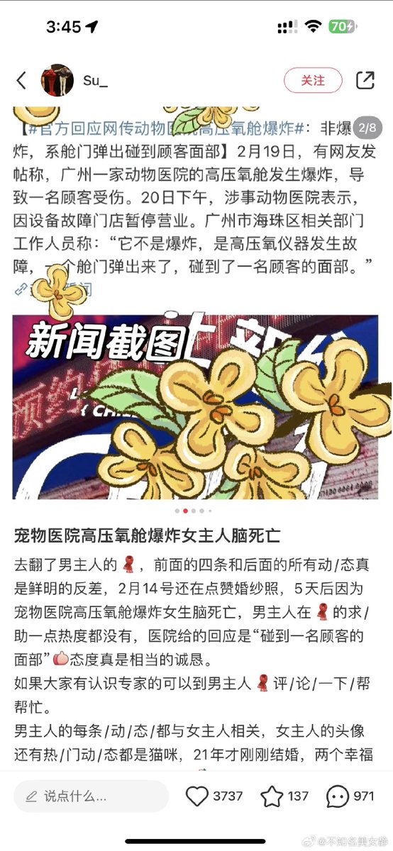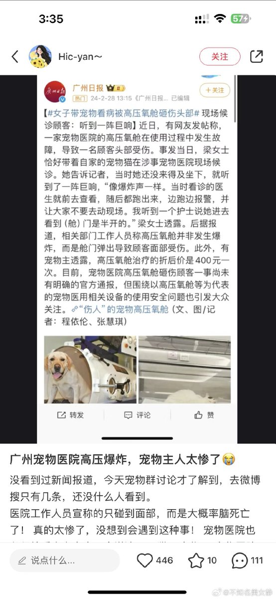 2月19日,一个女生带爱猫去广州爱诺百思动物医院宠物店接受高压舱治疗,治疗时高压舱突然爆炸,导致女生现在脑死亡,五官碎裂,头骨整体裂开,人还在icu抢救中国政府:不是爆炸,是舱门碰到了面部