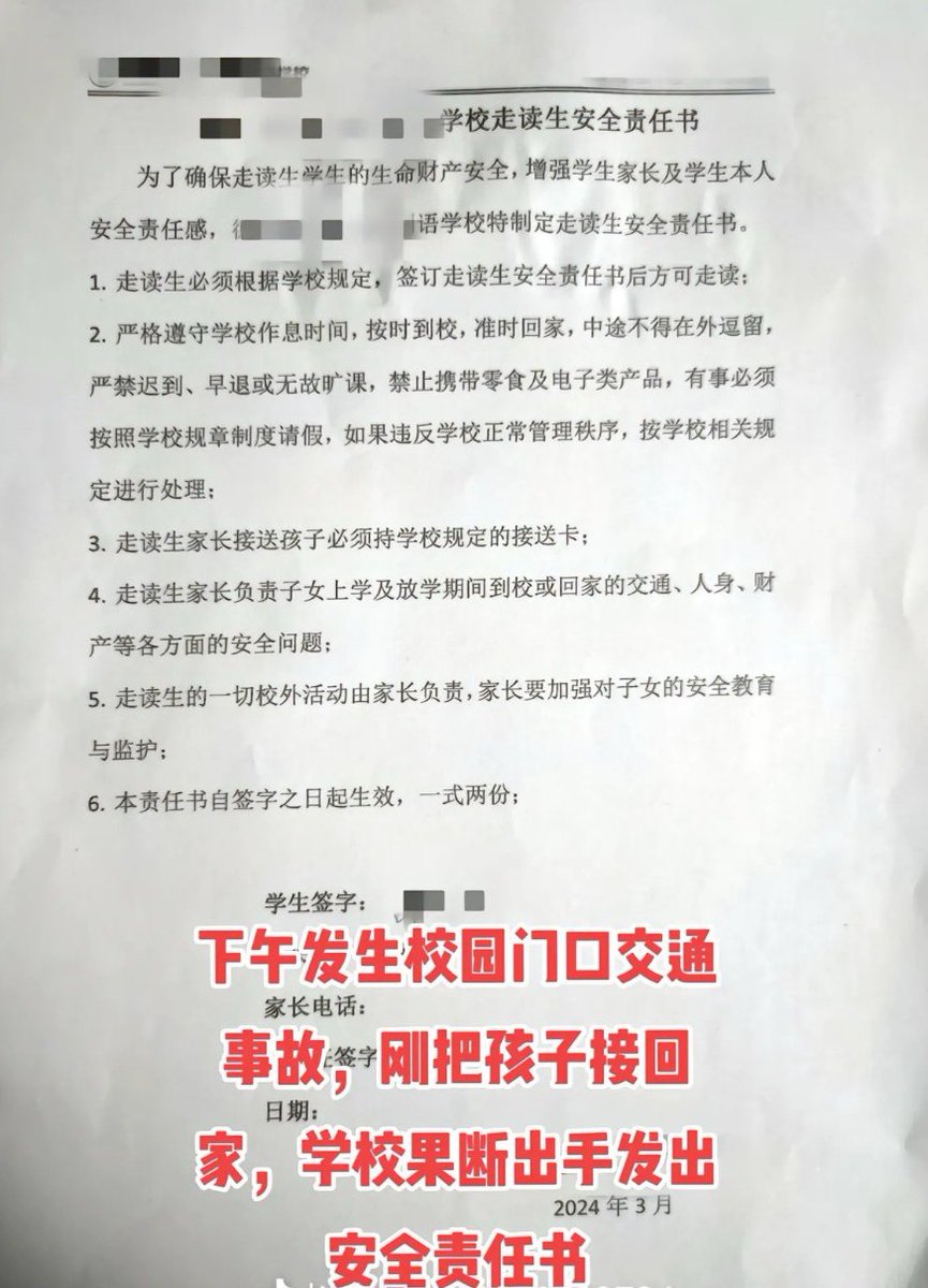 德州车祸发生后,当地其他学校立即开展行动——要求家长签署“走读生安全责任书”。家长必须同意出了校门之后一切安全由自己负责才可以让孩子走读。