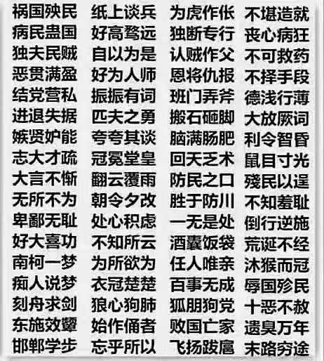为了形容一个人,列出这么多成语,尚言犹未尽。这大概就是罄竹难书的意思吧。 现在搞文革搞不成 搞改革也是搞不成 半文革半改革 相当于半封建半殖民地吧…… 他被他自己卡住了 邓是打左灯右行 他是挂前进挡倒退 其实是在原地打转 电跟油都耗尽了 他坐在车里发呆 车在人也在 坚决不下岗 网上高人评当前形势