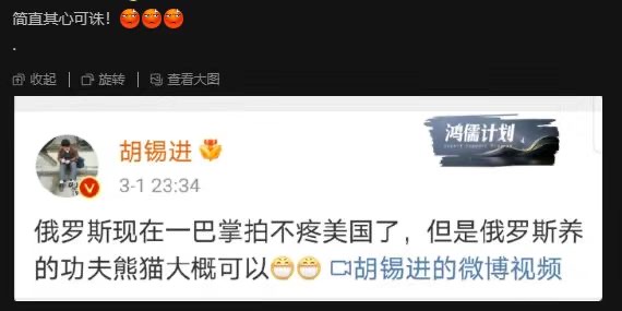 纪念胡锡进著名微博“俄罗斯现在一巴掌拍不疼美国了,但是俄罗斯养的功夫熊猫大概可以”发表两周年。