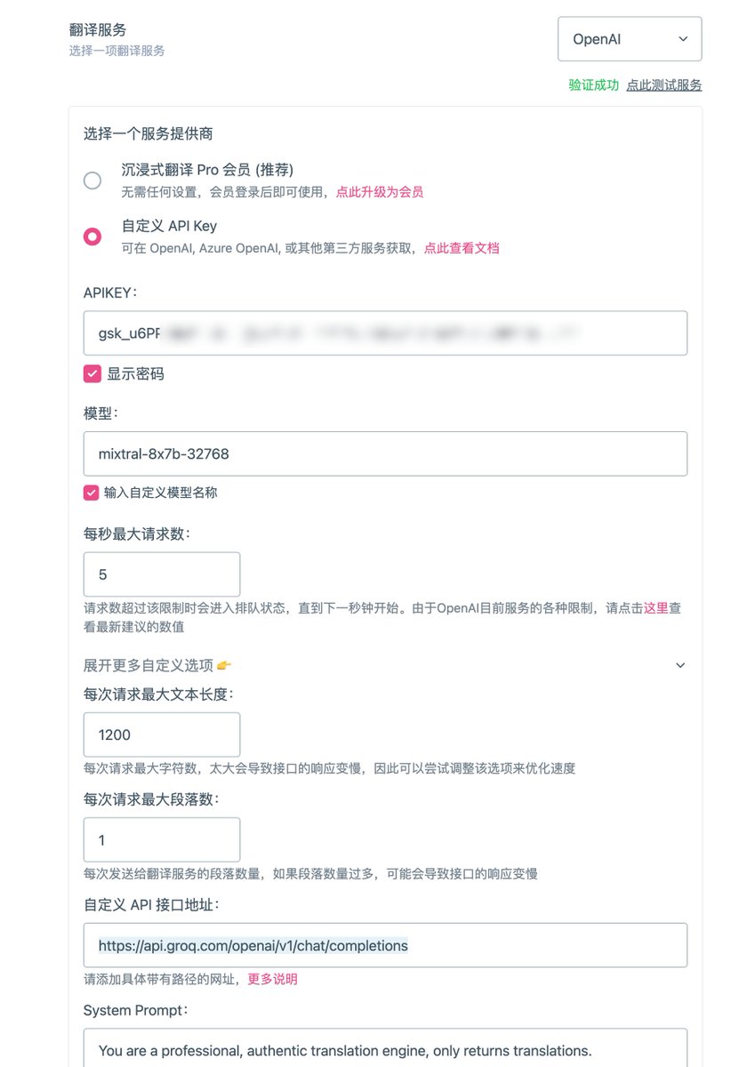 可以的,了解到 Groq key 兼容 OpenAI 后,我把沉浸式翻译改为 Groq 这样设置,翻译速度之快简直感人。而且目前还是白嫖,赶紧去申请体验一下吧