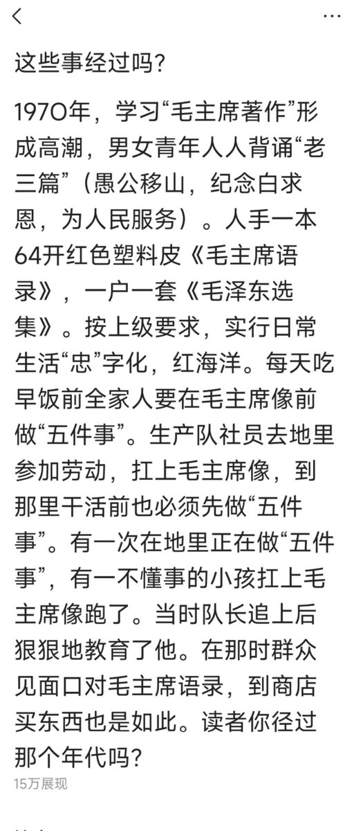亲历过。【这些事经过吗?】人人背诵“老三篇”(愚公移山,纪念白求恩,为人民服务)。人手一本《毛主席语录》,一户一套《毛泽东选集》。生活“忠”字化,红海洋。每天全家在毛主席像前做“五件事”。社员去地里劳动扛上毛像,干活前必须先做“五件事”。群众见面口对毛主席语录,到商店买东西也是如此。