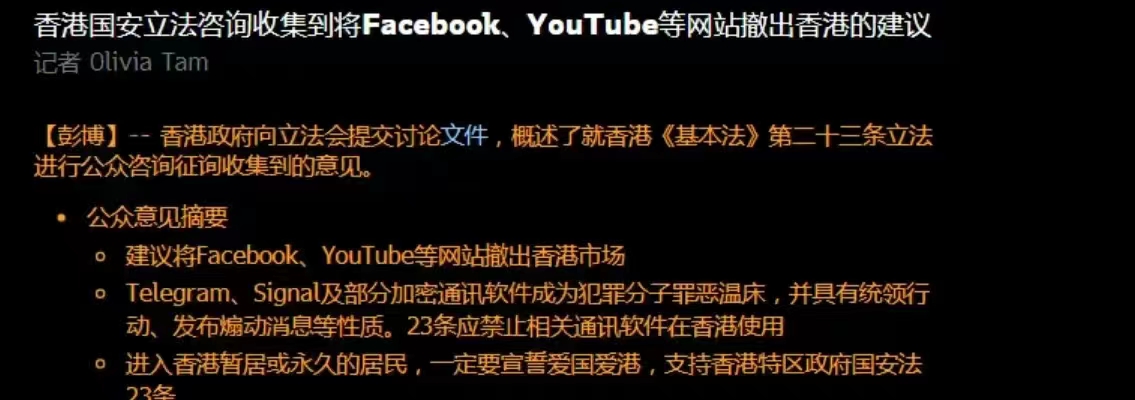 香港国安基本法23条立法咨询给出的建议包括禁止youtube,facebook,telegram等。