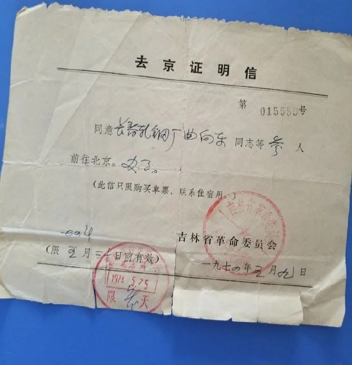 1974年,去京证明信,长春出发,5.25-5.30之间有效。