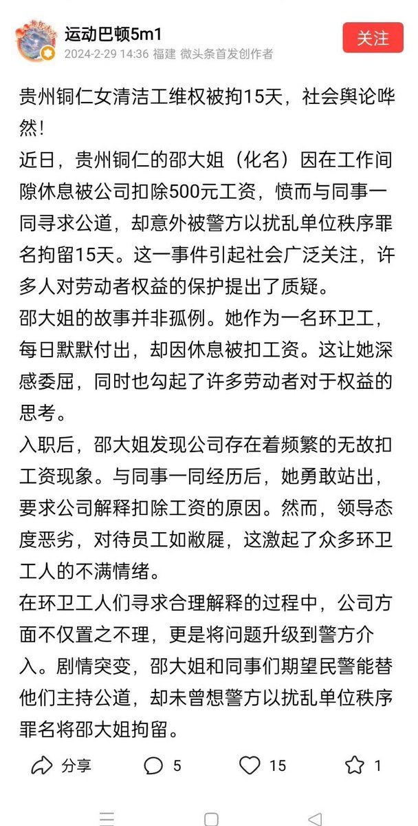 贵州铜仁,女清洁工在路边休息了一下,被罚款500元,她不服,找领导大吵了一架,领导报了警,清洁工以为民警来了会为她主持公道,却没想到她被认定扰乱单位秩序,拘留15天。