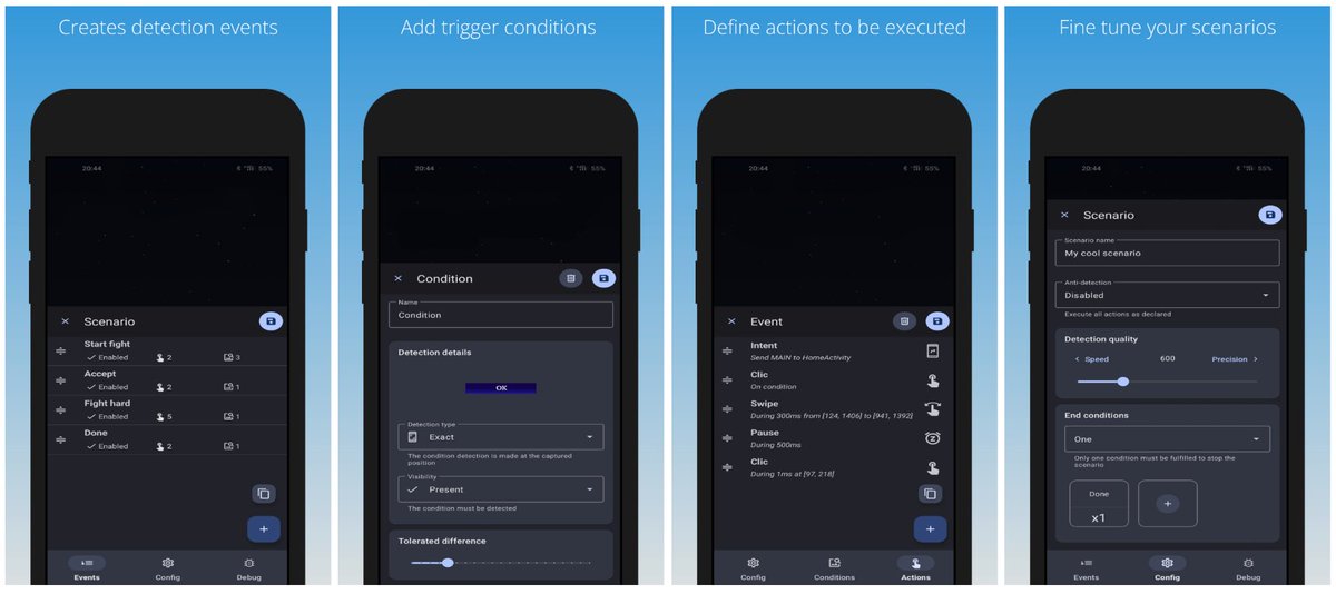 Smart AutoClicker 是一款 Android 应用程序,能通过自动在屏幕上点击帮您自动完成重复任务。与普通自动点击应用程序不同,它的点击并不是基于计时器来执行的。相反,它允许您从屏幕的一部分捕获一张图片,一旦再次检测到这张图片,就会执行点击。