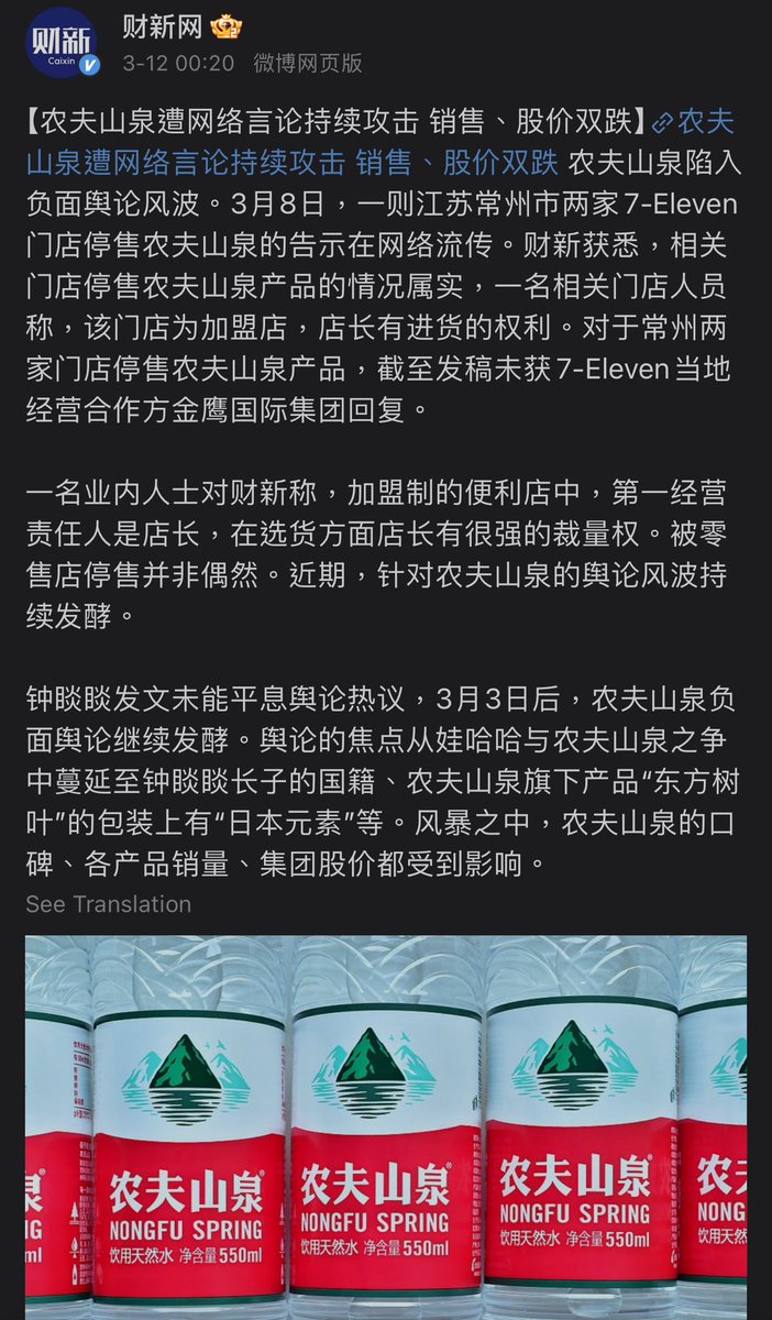 中共放任網路暴民對農夫山泉的持續攻擊,這清晰體現了官方立場。在官方看來,不是民營企業發展環境的問題,鬥農夫山泉是政治鬥爭問題,習近平需要這種鬥爭氛圍。