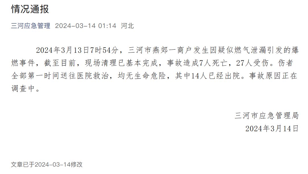 三河市燕郊3.13事故调查组:是输送中的管道泄漏导致,目前具体事故原因还要等待事故调查后续的通告。
