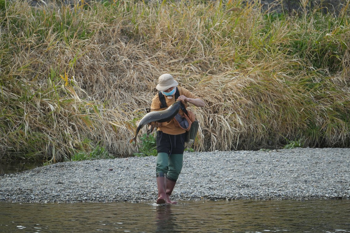今天去鸭川拍摄视频时,看到这位和这条大鱼格斗了有十分钟,终于把它拖上了岸。河岸和桥上聚集了好多看客,一片掌声!然后,他就把它放生了。。。
