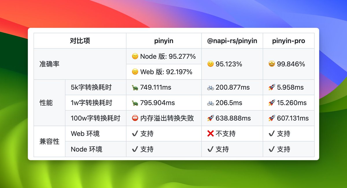 pinyin-pro 专业的 js 汉字拼音转换库,功能丰富、准确率高、性能优异。大佬们用它做个好看的 UI 吧,南方人表示由衷感谢,我真分不清翘舌音和后鼻音……比如牛和流、姥和脑😅n和l不分。主页在线运行Github