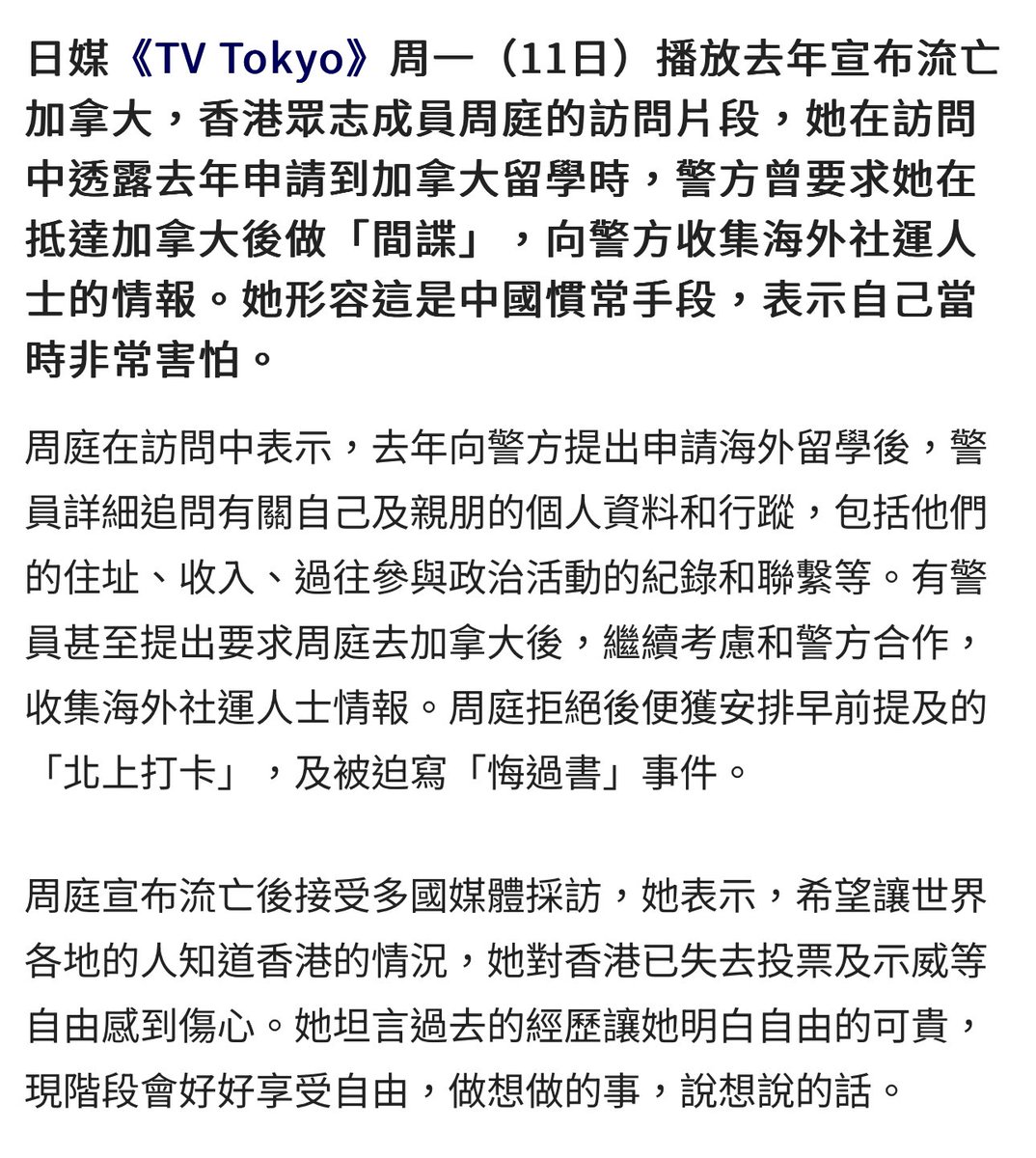 周庭近日接受日媒採訪透露:去年申請到加拿大留學時,警方曾要求她在抵達加拿大後做「間諜」,向警方收集海外社運人士的情報。她形容這是中國慣常手段。周庭這段描述顯然沒有引起輿論足夠重視,中共「放過」有些人是有目的的。但是,相信多數被「放過」的人會像周庭這樣不與魔鬼交易。