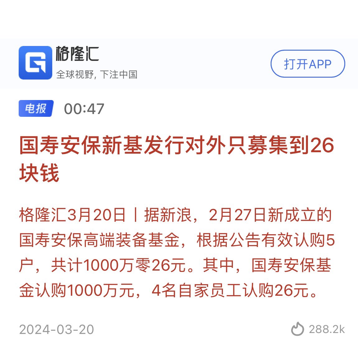 我真哭笑不得😅国寿安保新基金对外发行只募集到26元,还都是4名自家员工认购的🤣