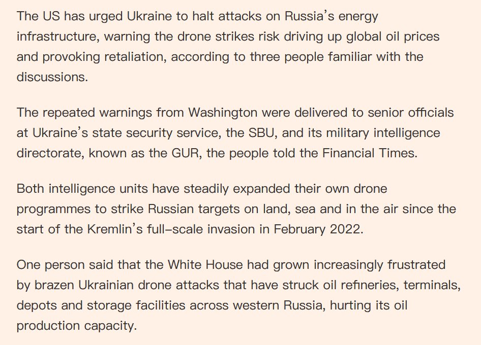 据FT报道,美国政府已向乌克兰国家安全局(SBU)及乌克兰国防部情报总局(GUR)的高级官员发出多次警告,停止对俄罗斯能源基础设施的袭击,警告无人机袭击可能推高全球油价,并引发俄罗斯对西方国家的报复行动。