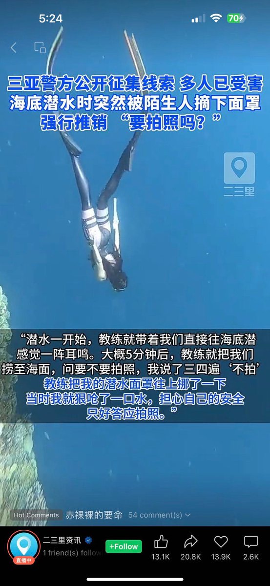三亚潜水:“下水前问是否拍照 我坚决说不拍结果他直接关闭吸气口 并把我往水里按”“我说了三四遍不拍,教练把我的潜水面罩往上挪了一下,当时我就狠呛了一口水,担心自己的安全只好答应拍照。”我们去三亚只敢住五星级,跟酒店里的活动。我老公说这钱就相当于交保护费了。没办法,祖国处处黑社会。