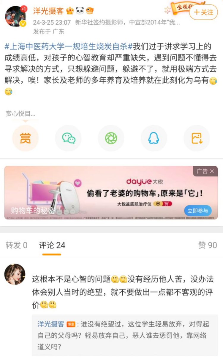 在上海中医药大学规培生自杀近两个月后,媒体进行了相关报道。但相关话题下方却充斥着各路博主对其自杀的指责