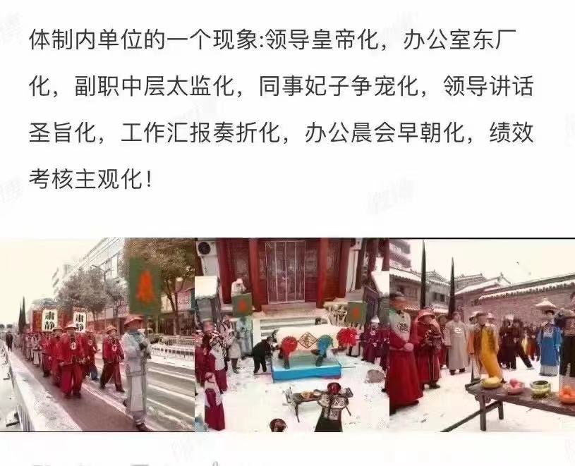 简称“八化”?今日酷评【体制内单位的一个现象】领导皇帝化,办公室东厂化,副职中层太监化,同事妃子争宠化,领导讲话圣旨化,工作汇报奏折化,办公晨会早朝化,绩效考核主观化!