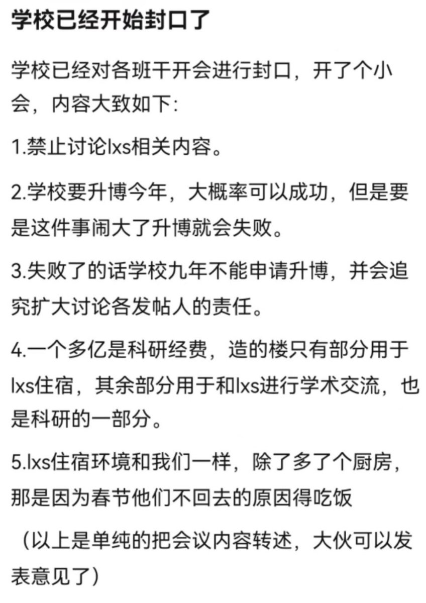 之后,校方召集学生代表开会表示,学校今年要升博,如果因为这件事导致升博失败,将追究所有扩大讨论的发帖人的责任。