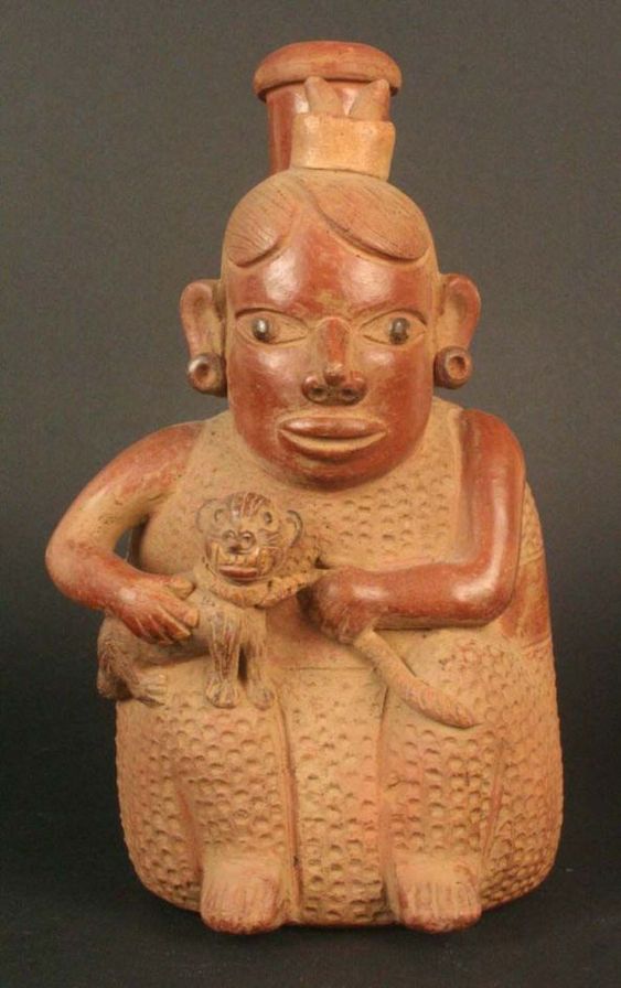 Ceramio que representa a un personaje que tiene atado con una soga a un felino, probablemente por sus características referente al tamaño corresponda a un gato montés o andino.Cultura Chavín.Imagen: Arqueología Peruana.Alejandro A Mendoza