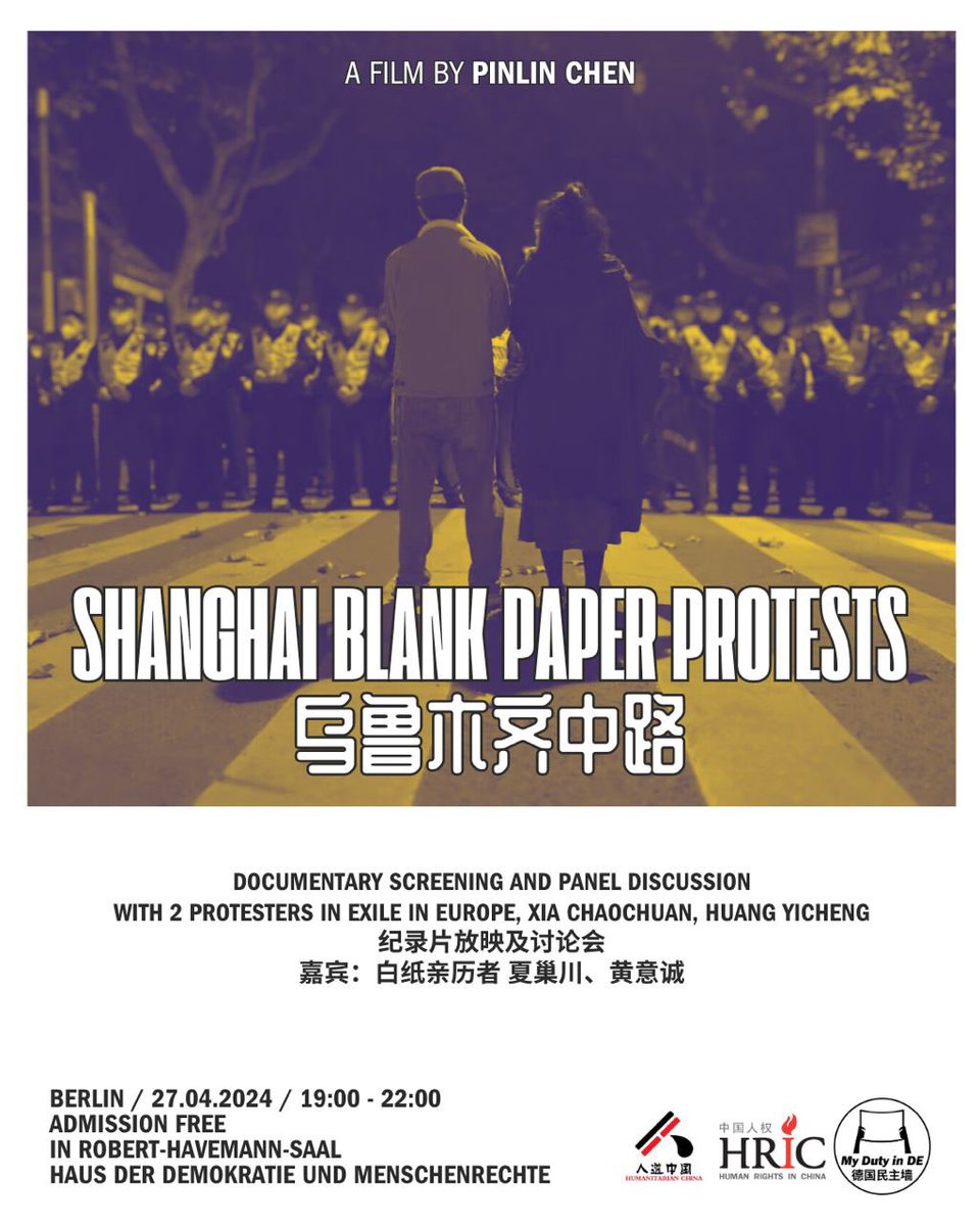 2024年4月27日,My Duty in Deutschland德国民主墙作为在德华人流散社群,将会在柏林自由民主之家Haus der Demokratie und Menschenrechte放映陈品霖导演的纪录片《乌鲁木齐中路》,并邀请白纸运动亲历者夏巢川@karasu_ga_warau