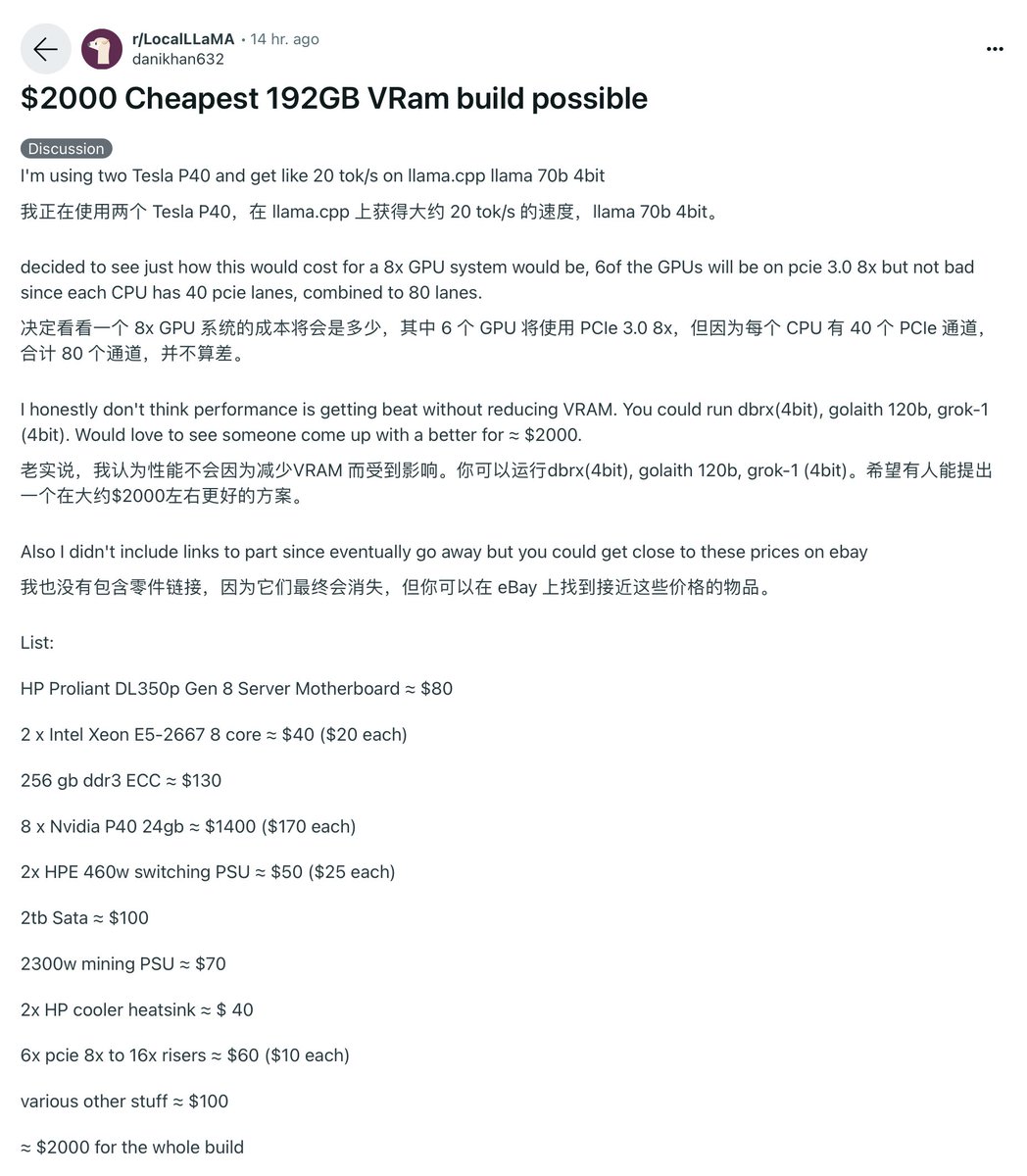 这位 Reddit 网友本地AI大模型配置击中多少垃圾佬的心?啧啧,闲鱼看了一些大件,能捡漏应该还要不到 $2000……HP DL380P Gen 准系统 ¥350E5-2667 ¥260(130一颗)16X16 256G ECC ¥7208 X TESLA P40 24GB ¥7200请不要贴脸开大在评论中提3090和灭火器。