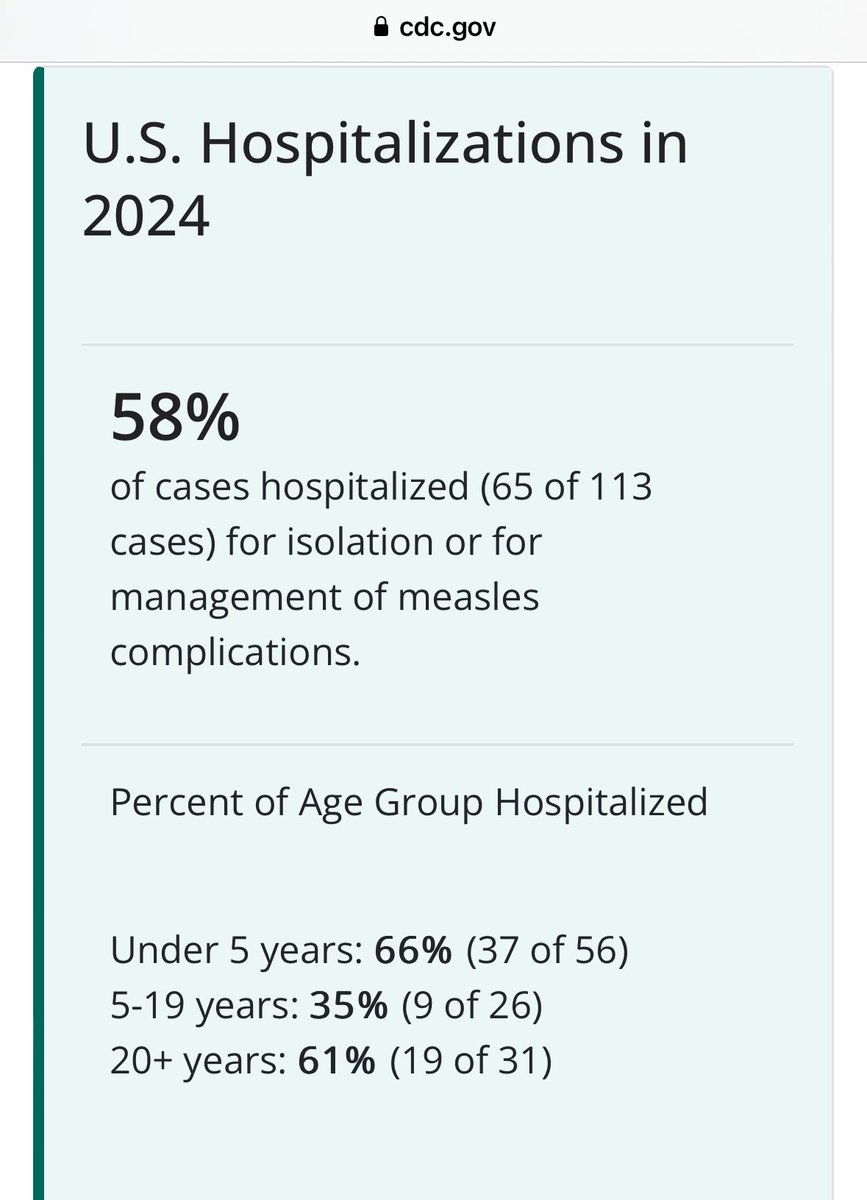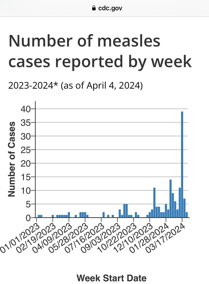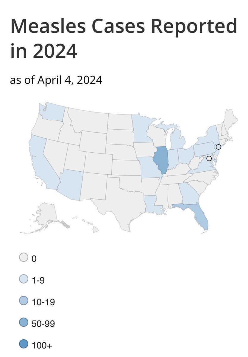 ⚠️SPIKE IN MEASLES—113 cases of US measles in Q1 of 2024, double the total for all of 2023. 📍95% of the cases were in those without 2 full doses of MMR💉vaccine (83% cases without any confirmed shots). Across 18 states—top 2 states are Illinois & Florida. 58% of all cases got…