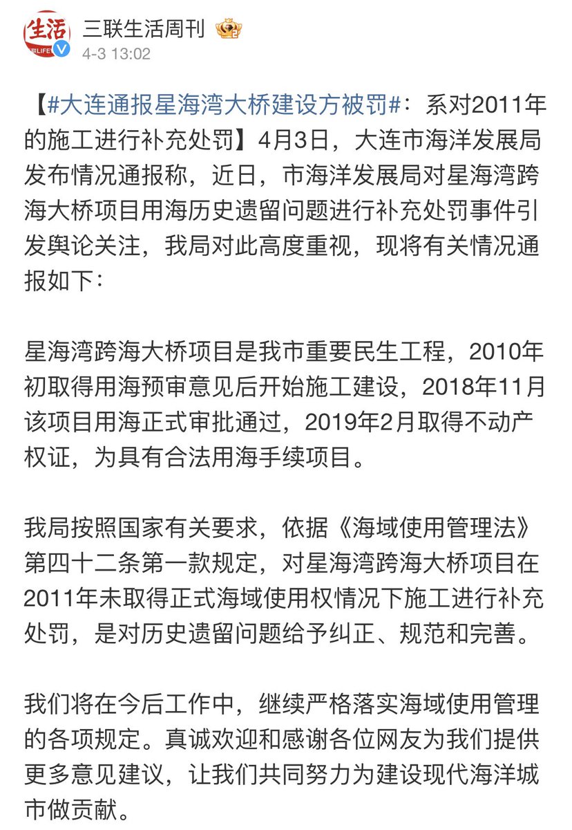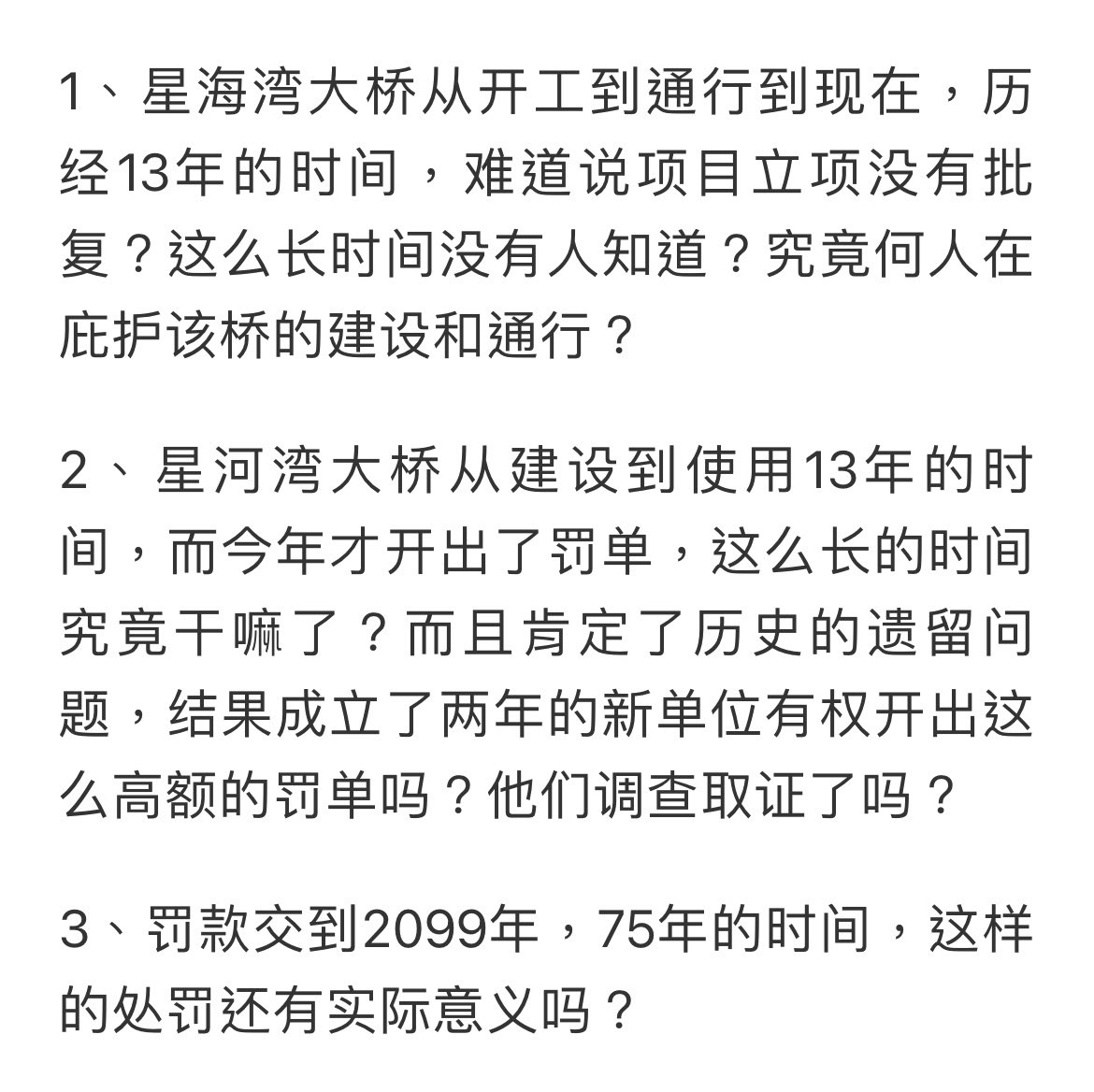 “大连星海湾大桥”2015年通车,被一个2022年才成立的“大连海洋发展局”按“违建”罚款2700多万,限期在2099年以前交完罚款。这就有点穿越时空像拿清朝尚方宝剑斩宋朝的官了。公众比较好奇的是:1. “大连海洋发展局”难道是要罚财政部的款吗?2. 羊毛出在羊身上,罚款限期到2099年这是给收过桥费找借口吧?