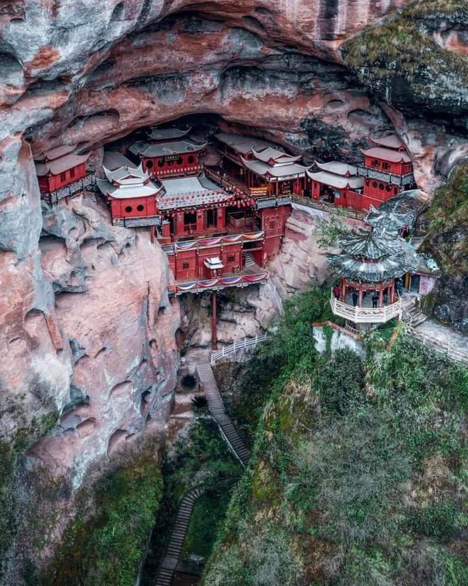 Ganluyan Temple, nestled in a deep gorge of red rocks, features a natural cave with stunning rock formations resembling a bell and a drum.